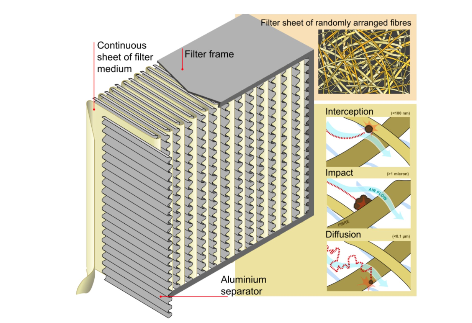 Khác với lưới lọc thông thường có các ô vuông đều đặn, màng lọc HEPA là một tấm thảm các sợi (thường là sợi thủy tinh) được sắp xếp hoàn toàn ngẫu nhiên và chằng chịt. Cấu trúc này tạo ra một mê cung 3D đối với dòng không khí. Để vượt qua "ma trận" này, các hạt bụi phải đối mặt với ba cơ chế vật lý riêng biệt, tùy thuộc vào kích thước của chúng.